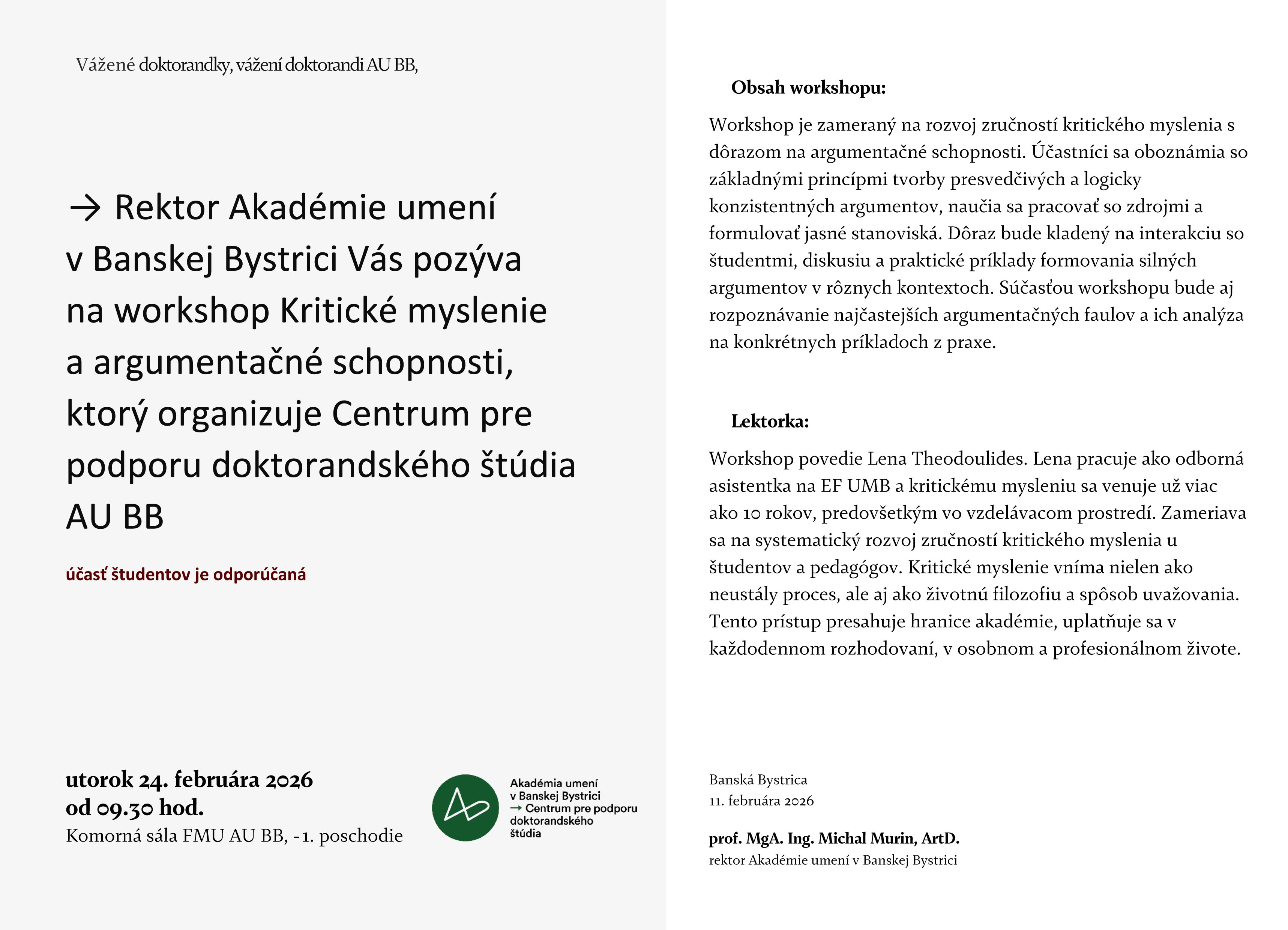 Workshop je zameraný na rozvoj zručností kritického myslenia s dôrazom na argumentačné schopnosti. Účastníci sa oboznámia so základnými princípmi tvorby presvedčivých a logicky konzistentných argumentov, naučia sa pracovať so zdrojmi a formulovať jasné stanoviská. Dôraz bude kladený na interakciu so študentmi, diskusiu a praktické príklady formovania silných argumentov v rôznych kontextoch. Súčasťou workshopu bude aj rozpoznávanie najčastejších argumentačných faulov a ich analýza na konkrétnych príkladoch z praxe.